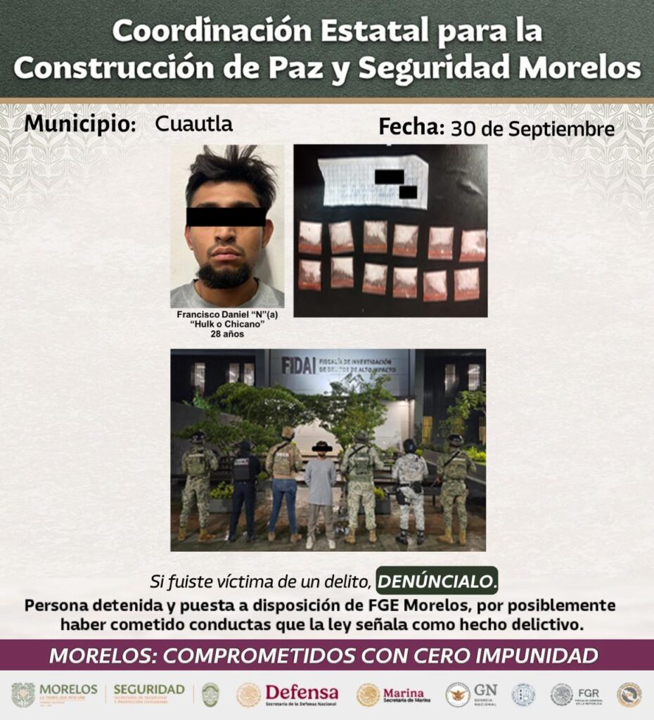 🚓 Dentro del operativo “Cuautla Segura”, se capturó también a Francisco Daniel “N”, alias “Hulk o Chicano”, de 28 años, con 12 dosis de droga y un mensaje de extorsión.