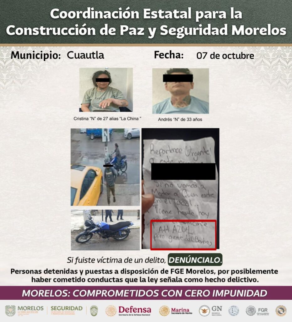 🏍️ Además, tras reportes al 911, fueron detenidos Cristina “N”, alias “La China”, y Andrés “N”, de 33 años, con drogas, una motocicleta sin placas y otro “papelito” con amenazas firmadas por un presunto grupo criminal.
